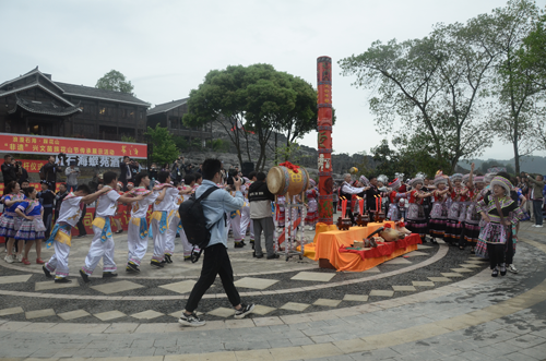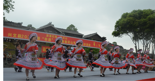 開幕式結(jié)束后,組織開展了從石海涌浪至石海僰寨旅游道上的苗族長(zhǎng)號(hào)、蘆笙、擺手舞、打蓮槍等表演形式的文化巡游活動(dòng)。