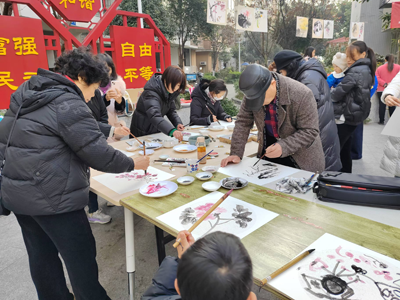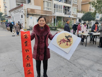 在書畫活動現(xiàn)場,書畫老師把事先畫好的寓意都很喜慶的書畫都寫好編號展示出來,居民們根據(jù)自己的喜好到書畫老師那報編號,書畫老師就會用靈巧的手,一會功夫,就畫出一副一模一樣的畫。觀的居民群眾都為老師點(diǎn)贊,紛紛都說,畫的好畫的好,帶一副回去掛在家里。