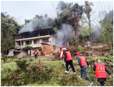 當(dāng)天上午,隨著王殿明家慰問幫扶活動(dòng)的結(jié)束,志愿者們愉快地踏上回歸的路途,而就在這時(shí),他們突然發(fā)現(xiàn)鄰村方向升起一股濃煙,“不好,有農(nóng)戶房屋著火了。”情況十分危機(jī),撲火刻不容緩。于是,大家迅速集結(jié),徒步趕往現(xiàn)場。只見火勢越來越大,煙霧直冒空中,而且逐漸往附近的山坡蔓延,如不及時(shí)撲滅,后果將難以想象。