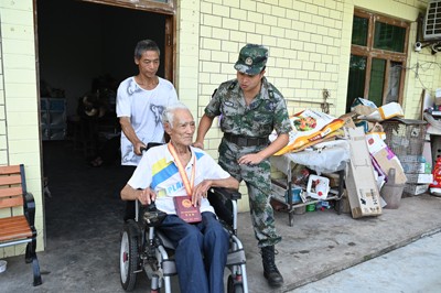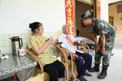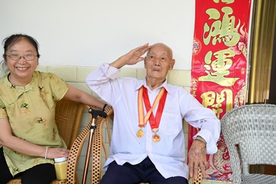 家住榮縣高山鎮(zhèn)紅觀音村的98歲抗戰(zhàn)老兵范志華,聽說退役軍人志愿服務(wù)隊(duì)的“戰(zhàn)友”們要來看望他,早早的把抗戰(zhàn)勝利80周年的紀(jì)念章佩戴在胸前,看到身著迷彩服的服務(wù)隊(duì)隊(duì)員走進(jìn)院壩時(shí),坐在輪椅上的他一個(gè)勁的揮手迎接。