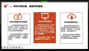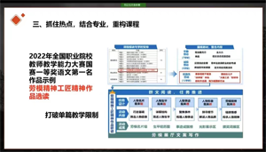 戴志敏老師結(jié)合近年來教師技能大賽獲獎案例,從“研究大賽方案,精準(zhǔn)對標(biāo)備賽”“立足課程標(biāo)準(zhǔn),開展專題教學(xué)”“抓住時事熱點,結(jié)合專業(yè)重構(gòu)課程”等三個方面指導(dǎo)參會教師精準(zhǔn)備賽,提出“重點創(chuàng)新三大策略”開拓教師教學(xué)設(shè)計思路,并勉勵教師潛心備戰(zhàn)省賽決賽,凝心聚力做好比賽。