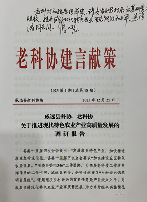2023年12月28日,威遠縣委副書記、縣長羅侯勇在縣科協(xié)、縣老科協(xié)呈送的《關(guān)于推進現(xiàn)代特色農(nóng)業(yè)產(chǎn)業(yè)高質(zhì)量發(fā)展的調(diào)研報告》上作出批示:“老科協(xié)的報告很詳實,請縣農(nóng)業(yè)農(nóng)村局認真研究吸收,提升威遠現(xiàn)代特色農(nóng)業(yè)發(fā)展能級和水平。送張濤同志閱。”